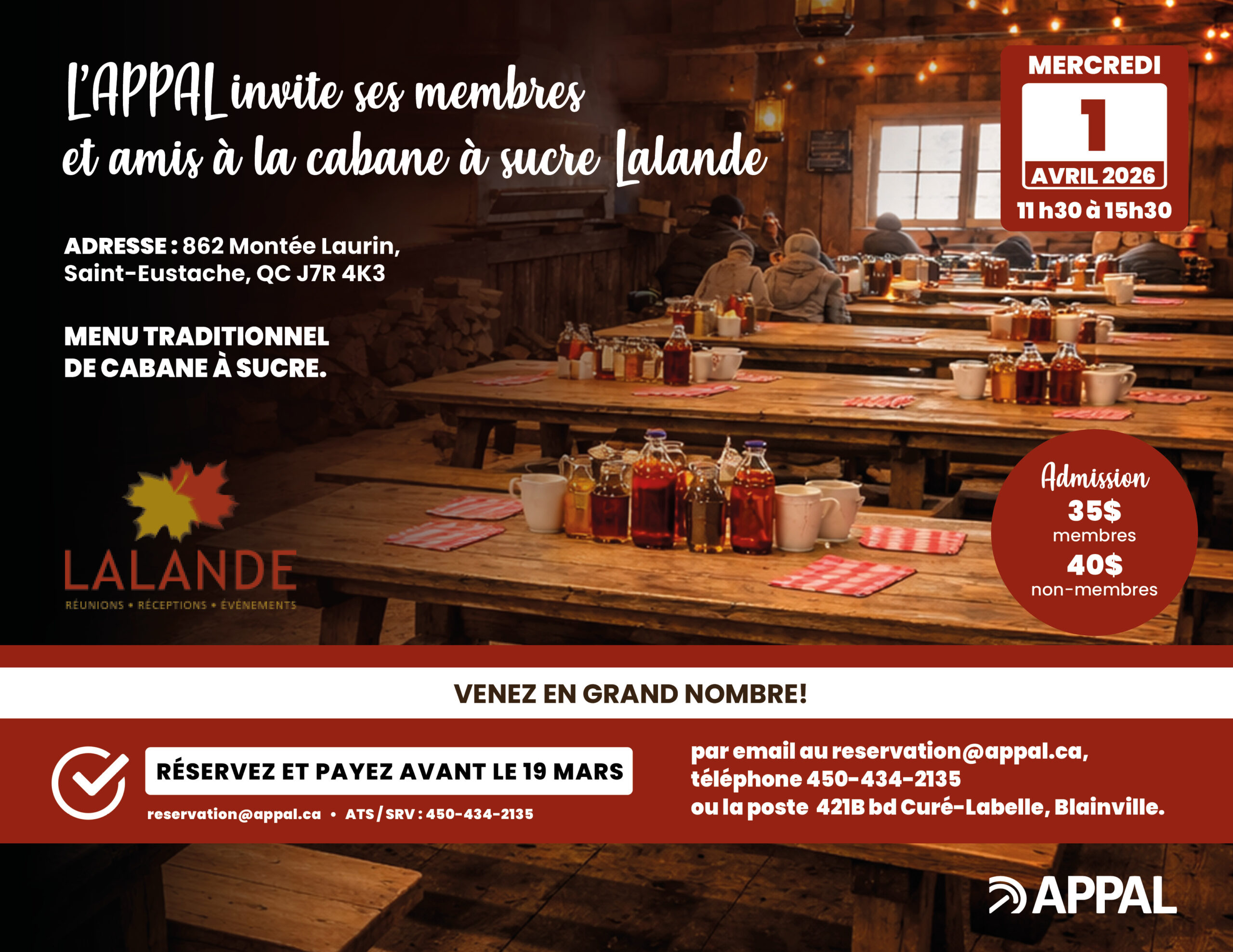 Amusez-vous à consulter le calendrier qui reçoit beaucoup d’amour et d’attention! On aime vous présenter nos publicités et vous offrir tous les détails qui sont nécessaires pour favoriser votre participation! Si une activité vous intéresse, n’oubliez pas de réserver votre place: reservation@appal.ca